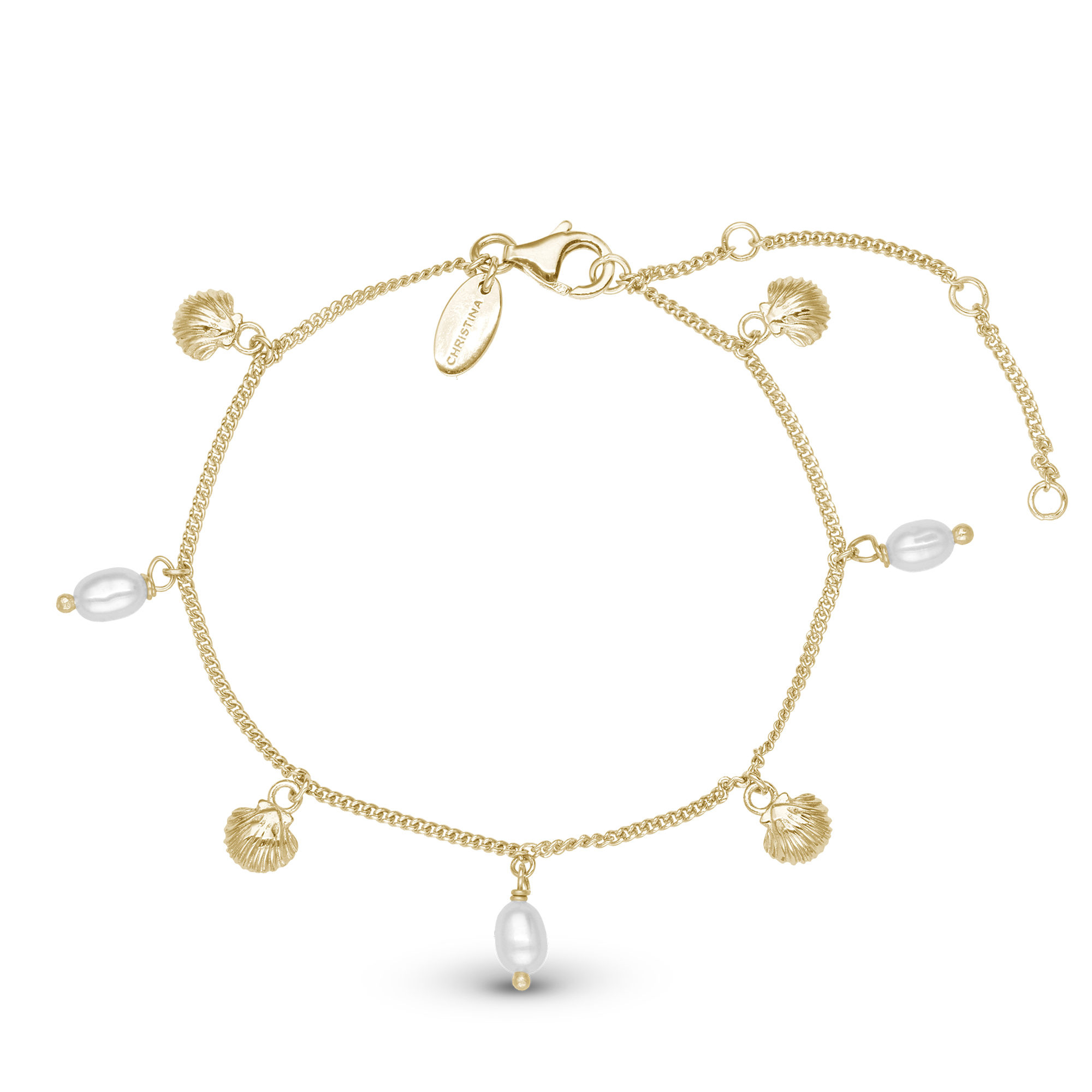 Pearl Shell Bracelet - Polished Gold Plated Sterling Silver with 3 white Freshwater Pearls