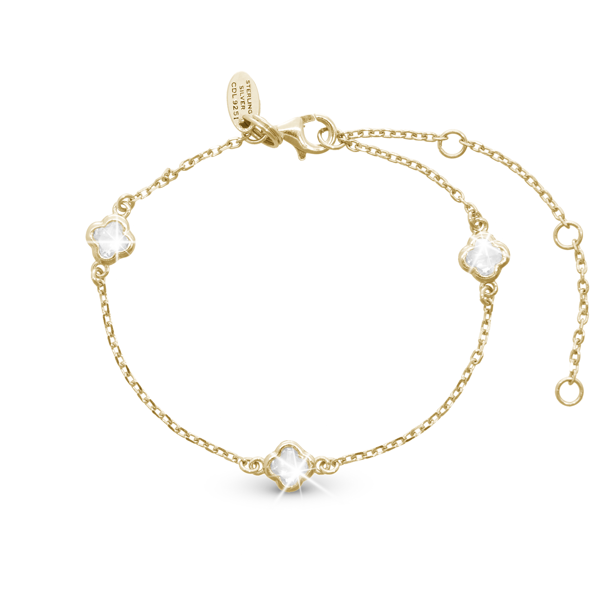 Glowing Clover Bracelet - Polished Gold Plated Sterling Silver with 3 white