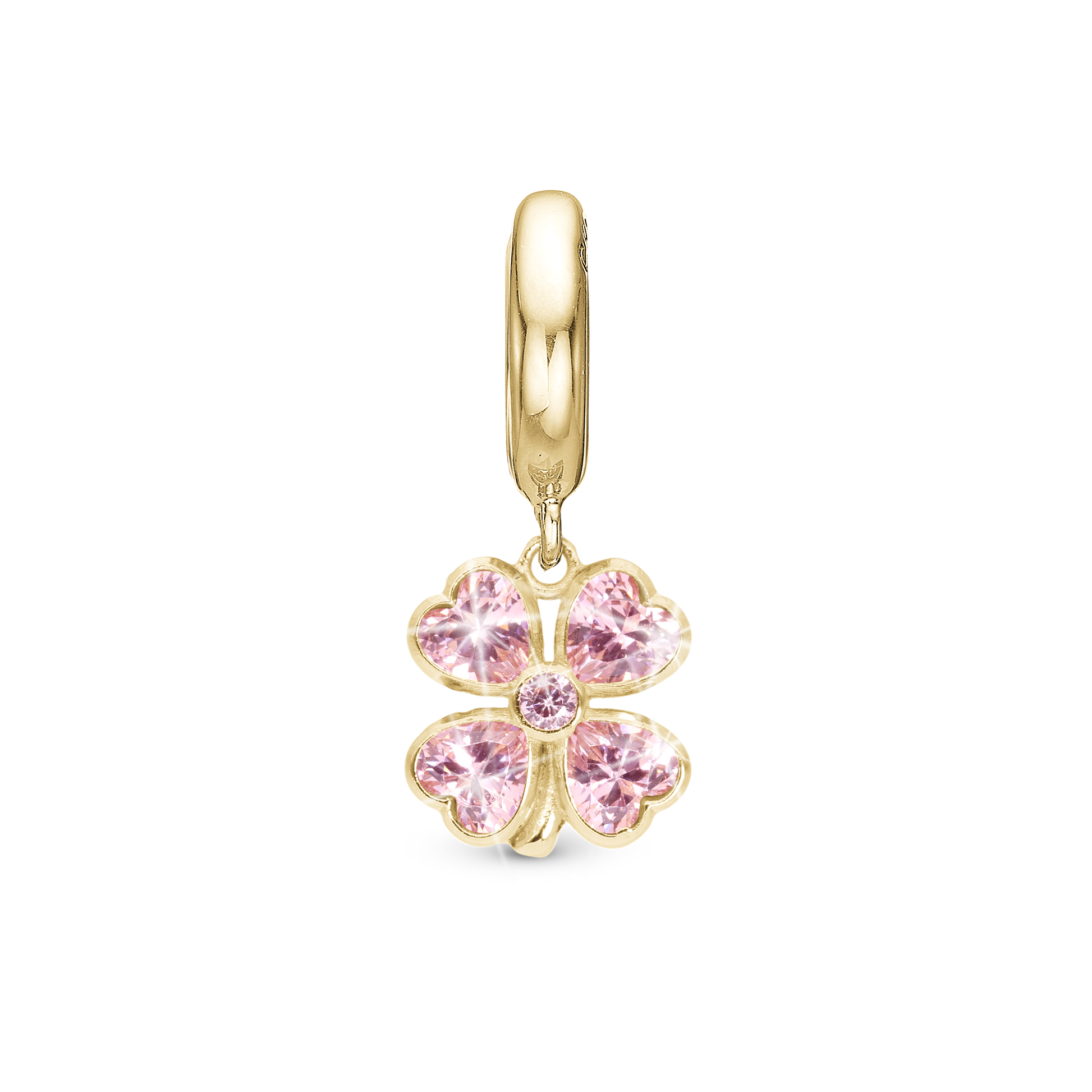Pink Heart Clover Drop Earring Charm 6 mm for Bracelet - Polished Gold Plated Sterling Silver with 5 Pinke Cubic Zirkonia