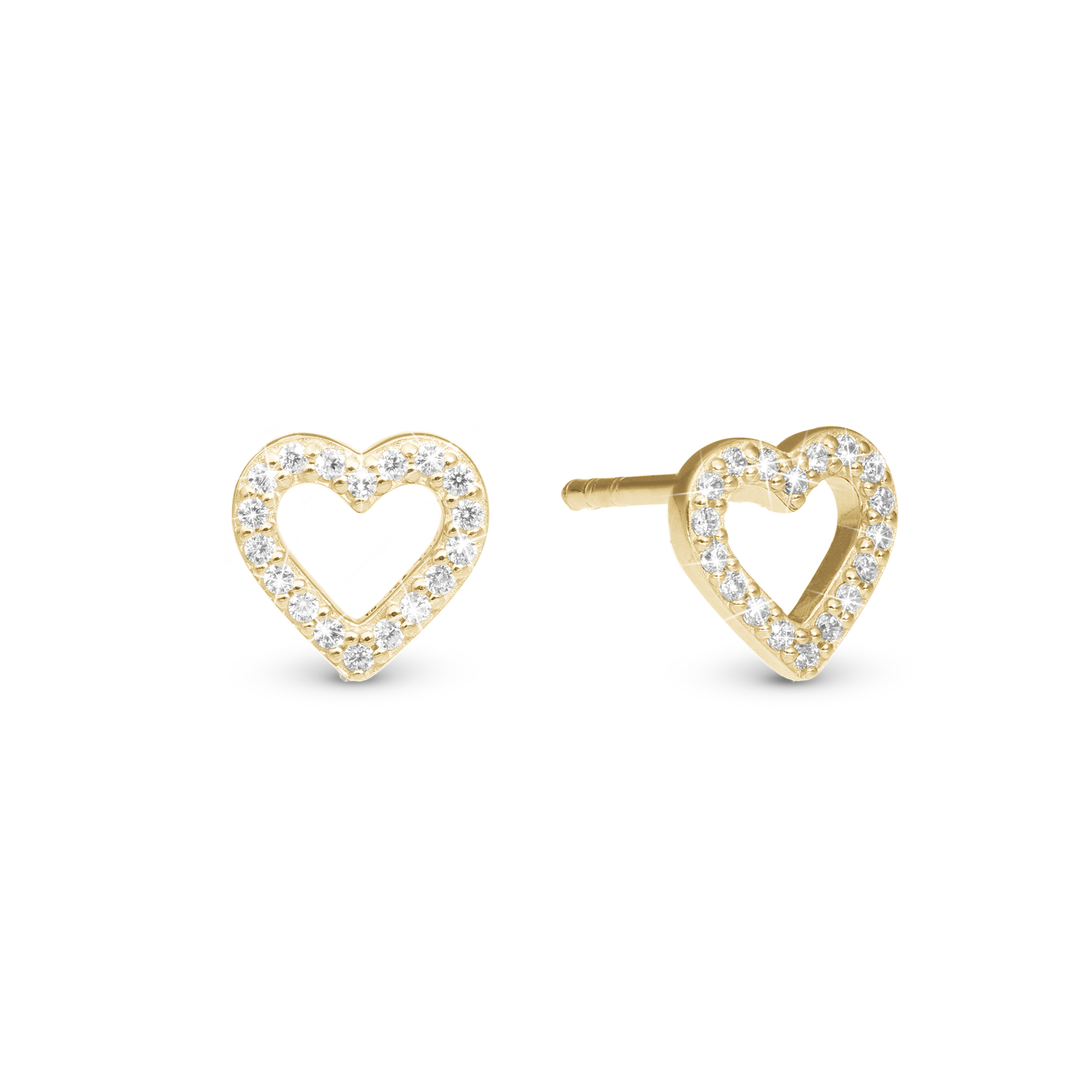Shimmery Heart Stud Earrings - Polished Gold Plated Sterling Silver with 36 white Cubic Zirkonia