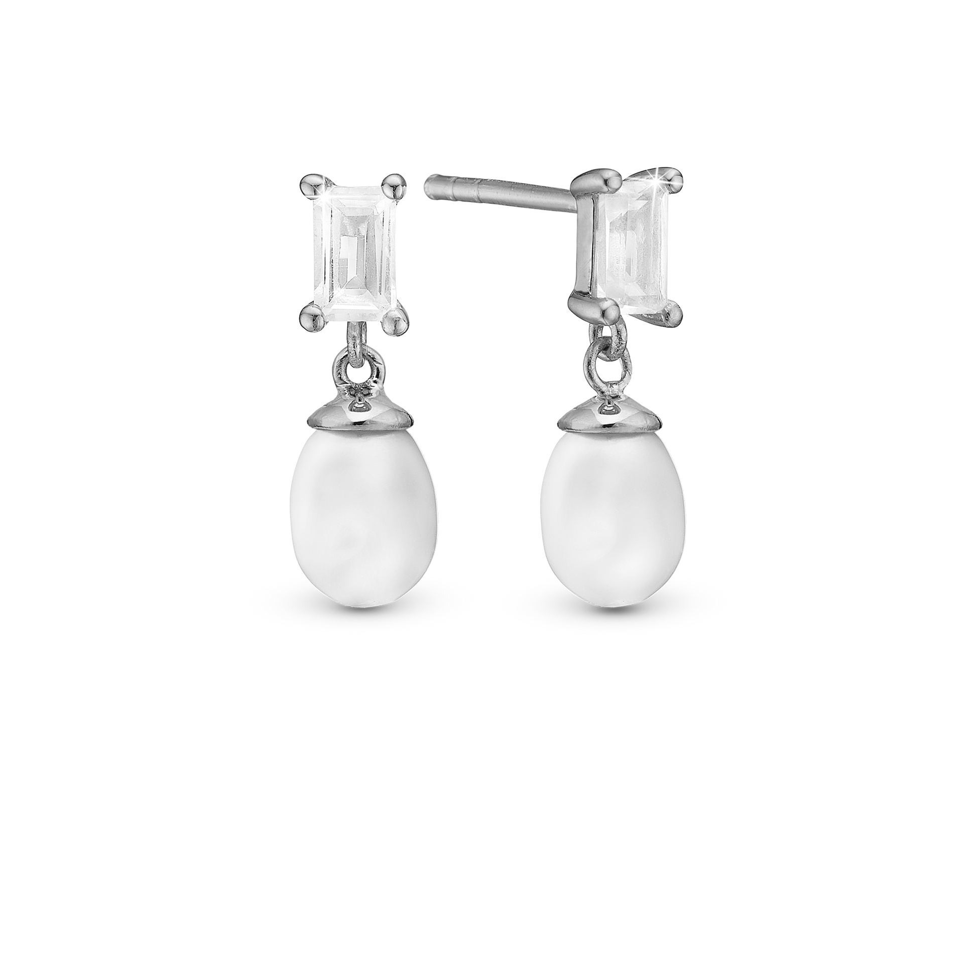 Pearl Baguette Stud Earrings - Polished Sterling Silver with 4 white Ferskvandsperler