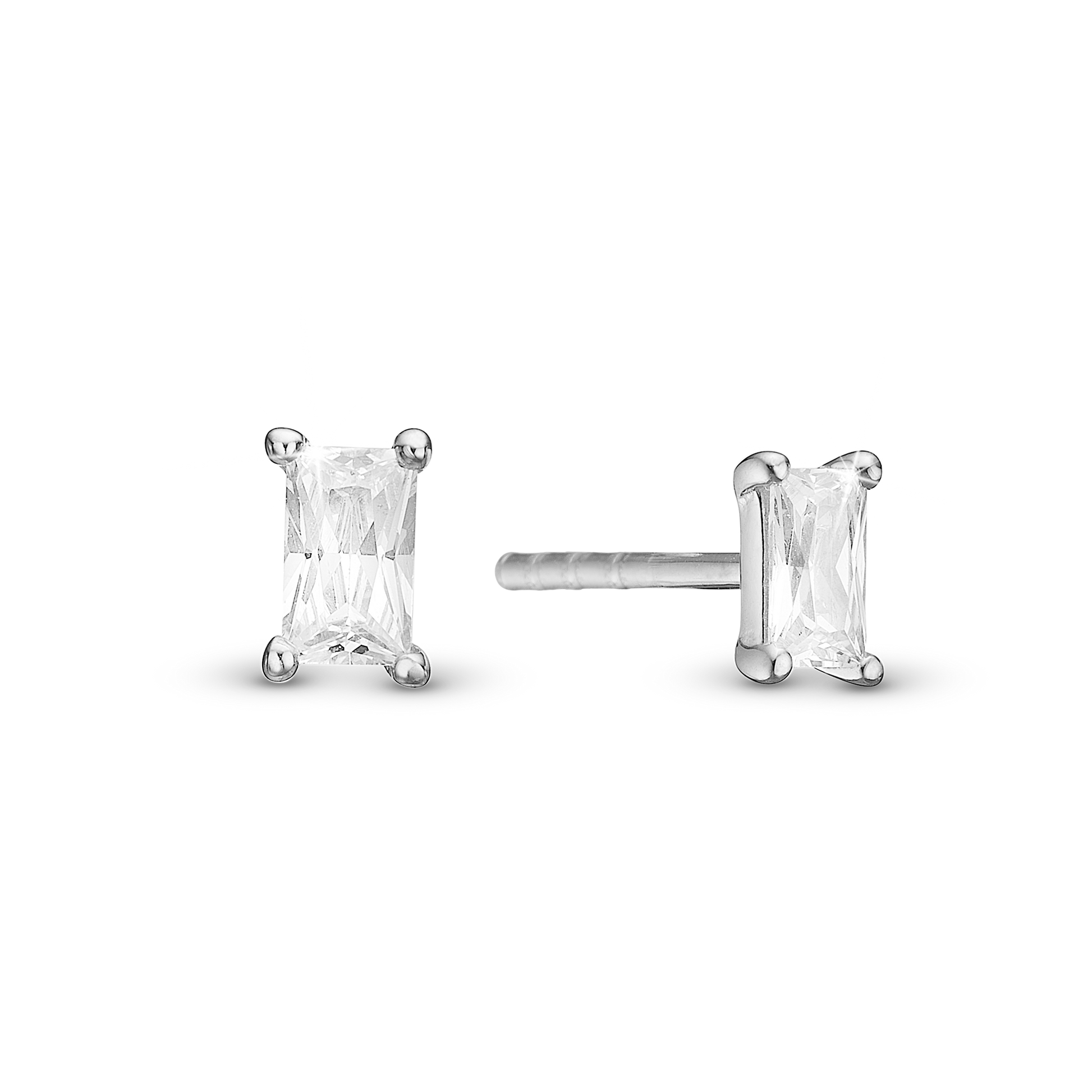 White Baguette Stud Earrings - Polished Sterling Silver with 2 white Cubic Zirkonia