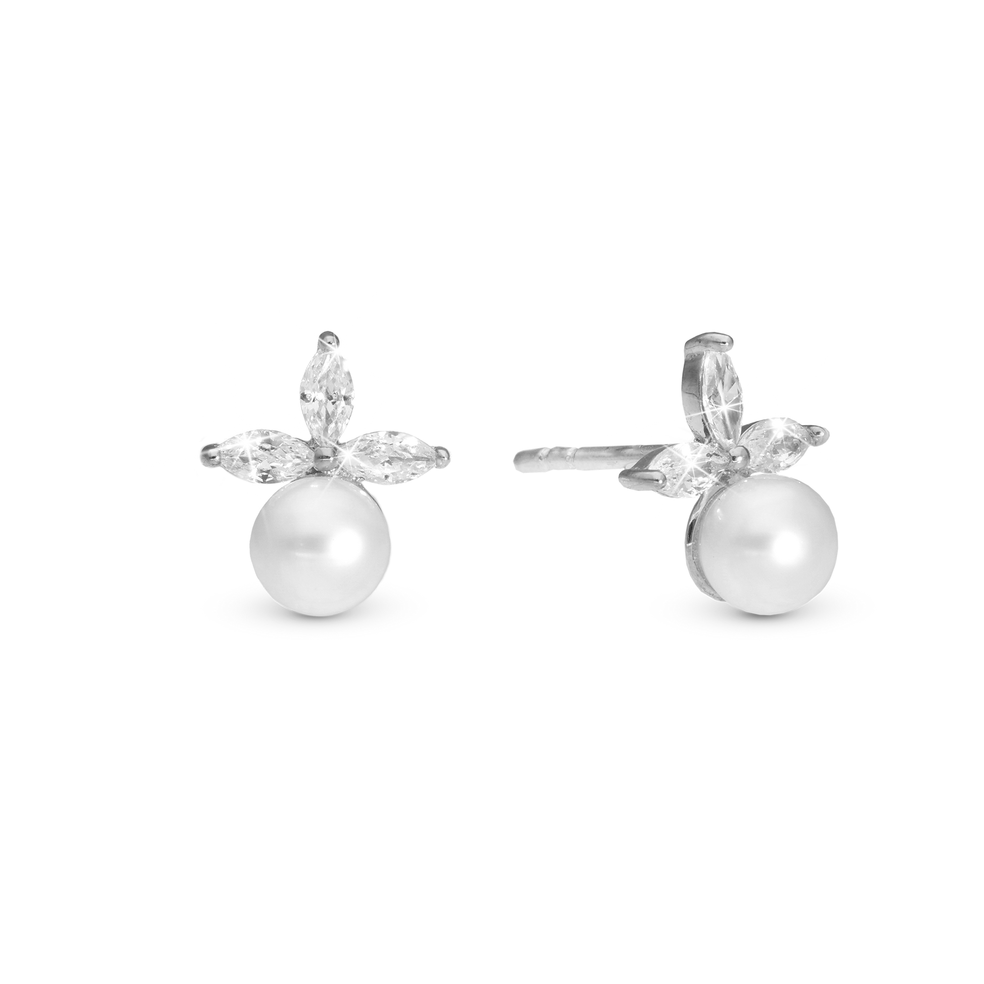 Pearl Lotus Stud Earrings - Polished Sterling Silver with 6 white Cubic Zirkonia