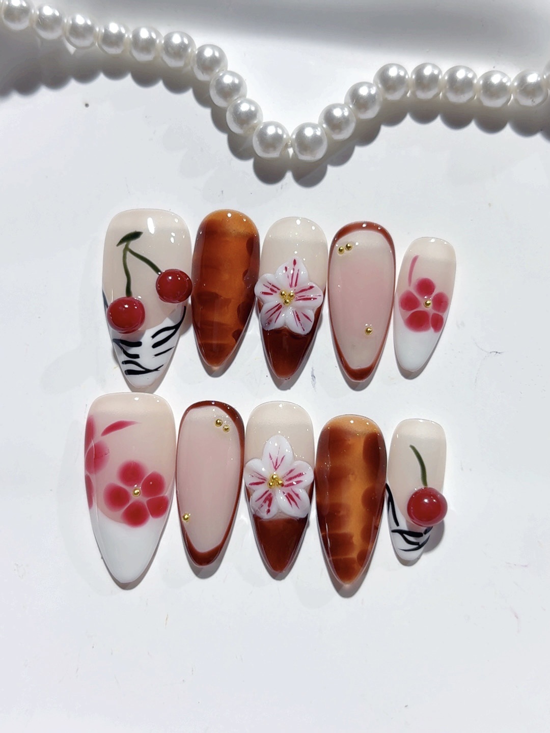 Amber Almond Nail Three-dimensional Carved Autumn And Winter Painted Cherry